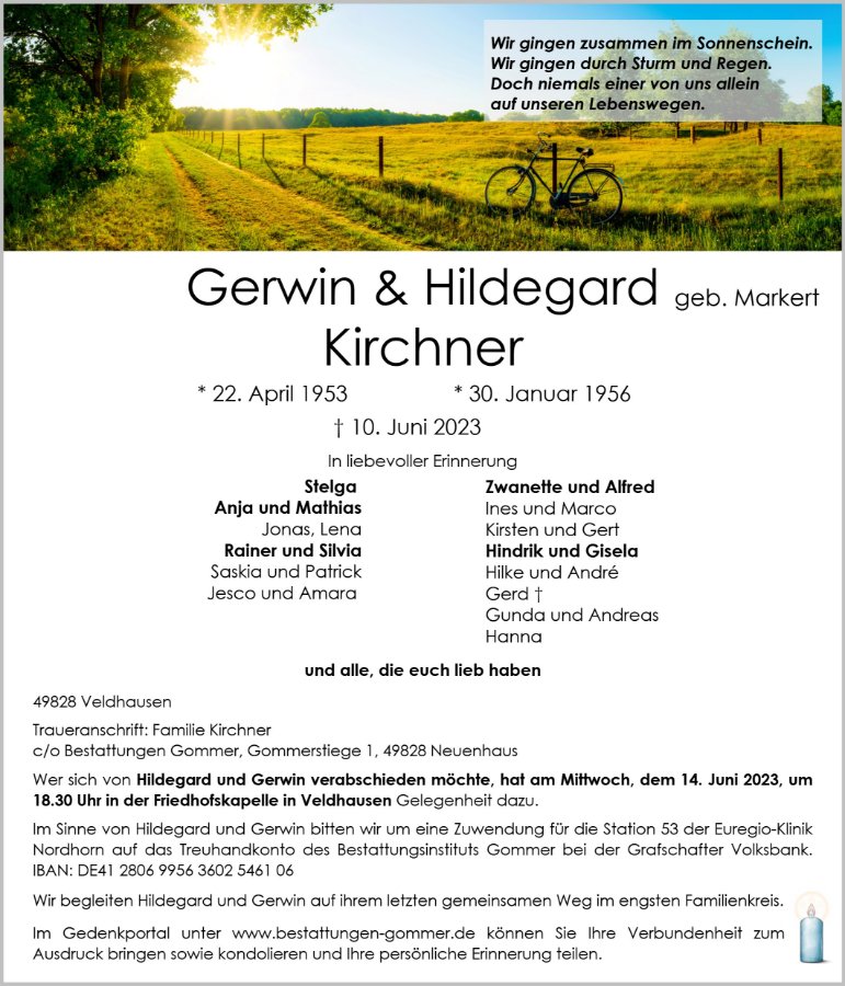 Im Sinne von Hildegard und Gerwin bitten wir um eine Zuwendung für die Station 53 der Euregio-Klinik Nordhorn auf das Treuhandkonto des Bestattungsinstituts Gommer bei der Grafschafter Volksbank.