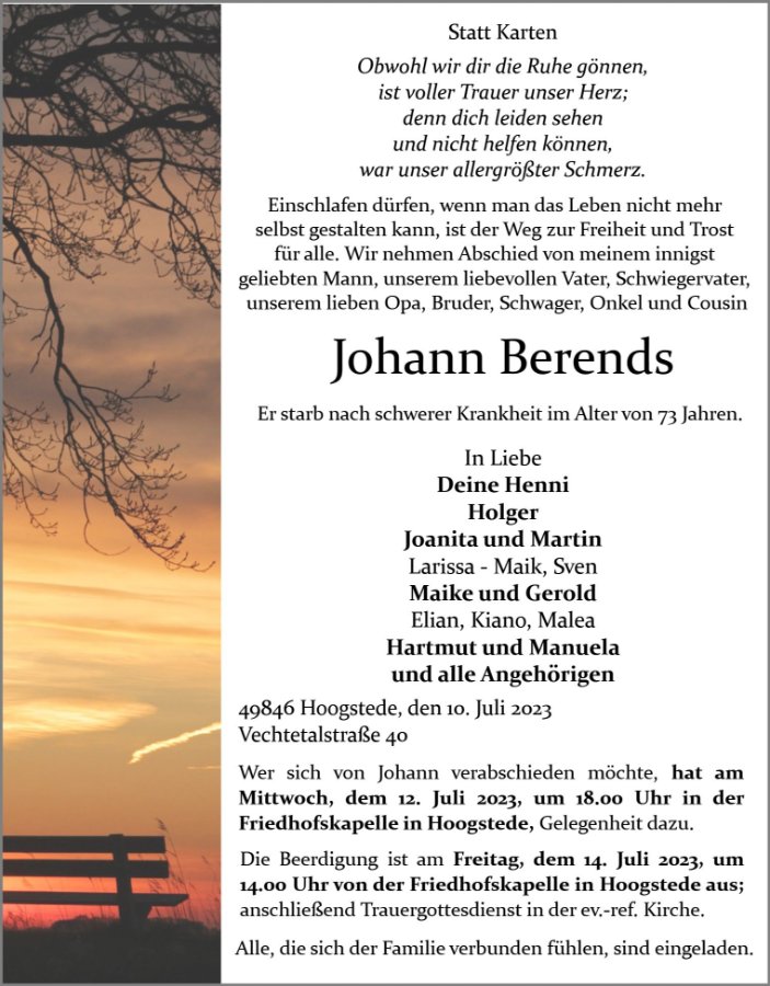 Liebe Familie Berends es ist sehr schwer den geliebten Mann, Papa, Opa los zulassen. Ich wünsche euch viel Kraft in dieser schweren Zeit .Meine große Anteilnahme Gert Roetmann