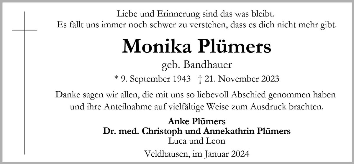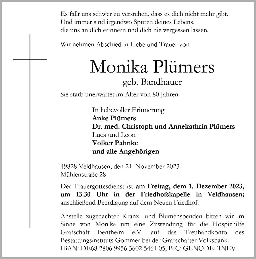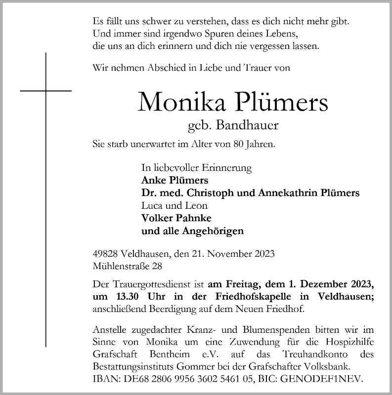 Anstelle zugedachter Kranz- und Blumenspenden bitten wir im Sinne von Monika um eine Zuwendung für die Hospizhilfe Grafschaft Bentheim e.V. auf das Treuhandkonto des Bestattungsinstituts Gommer bei der Grafschafter Volksbank.